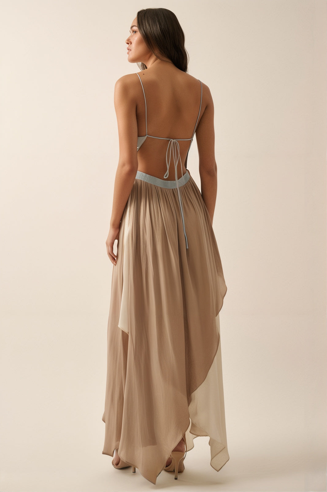 A colorblock, woven maxi dress with the following features: Semi-sheer chiffon fabric. Plunging neckline. Sleeveless. Layered, diagonal skirt. Wrapped tulip hem. Open back with self tie closure. Ankle length. Relaxed fit. * Black-Cream-Taupe 3rd cut SOLD OUT. 4th cut ETA: 4/30/2024. Model Info: Height: 5 ft 9 in | Bust: 31 in | Waist: 24 in | Hips: 34 in | Wearing Size S.