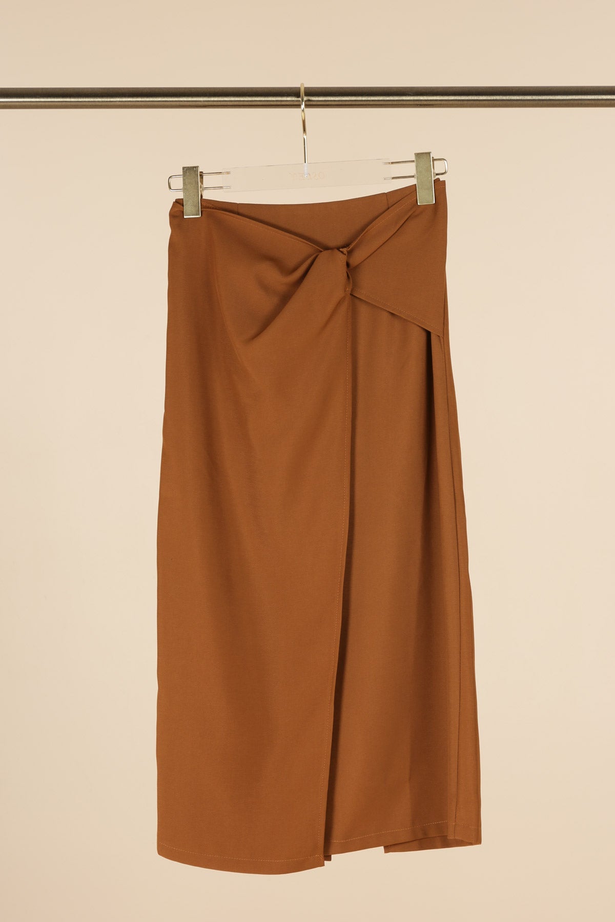 Get ready to turn heads with our Brown Corner Tie Skirt. This playful midi skirt is made from 100% Polyester and features a unique corner tie detail.