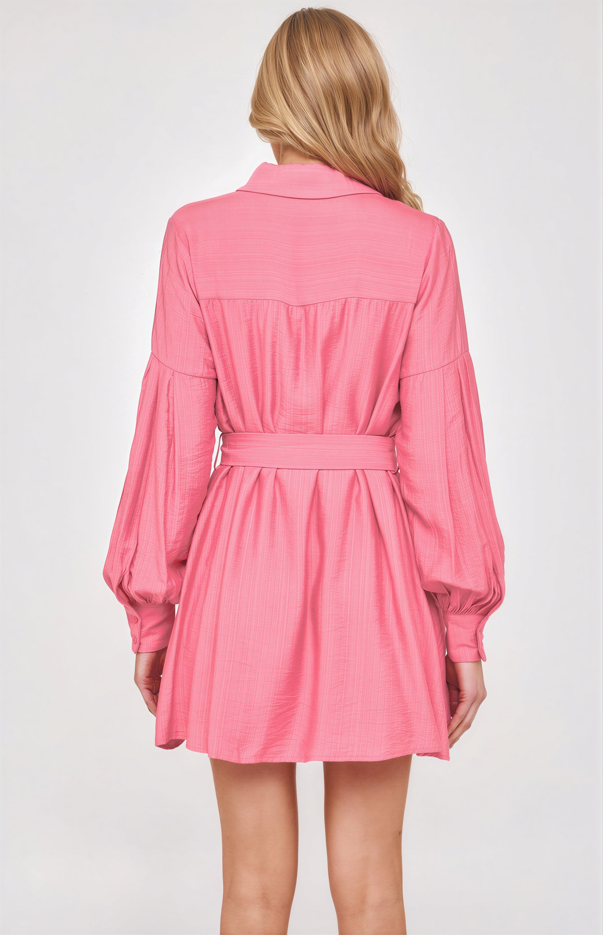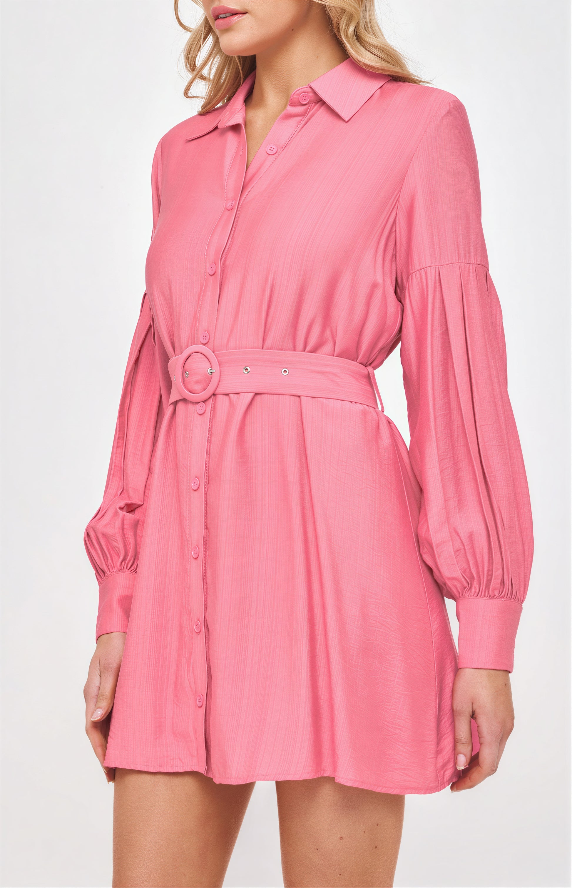 Discover comfort and style with the Pink Long Sleeve Shirt Dress by Winnie & Co. Made with 85% Rayon and 15% Polyester, this dress features a collared shirt design with front button up details, pleated bubble sleeves, buttoned cuffs, and a self fabric buckle belt. Fully lined for all-day comfort.